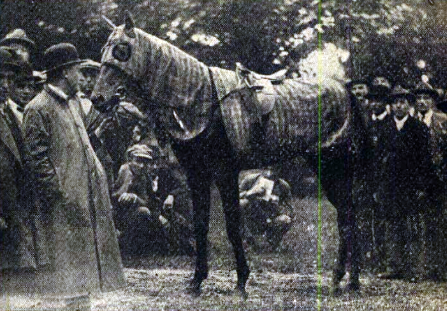 HANDFUL 3 éves pejmén (Mindegy-Handabanda) a Lesvéri ménes büszkesége, a magyar derby nyertese, a derby befutása után costumejében. Előtte trénere ifjabb Mravik Pál áll s boldogan néz lovára. Harsányi felv.