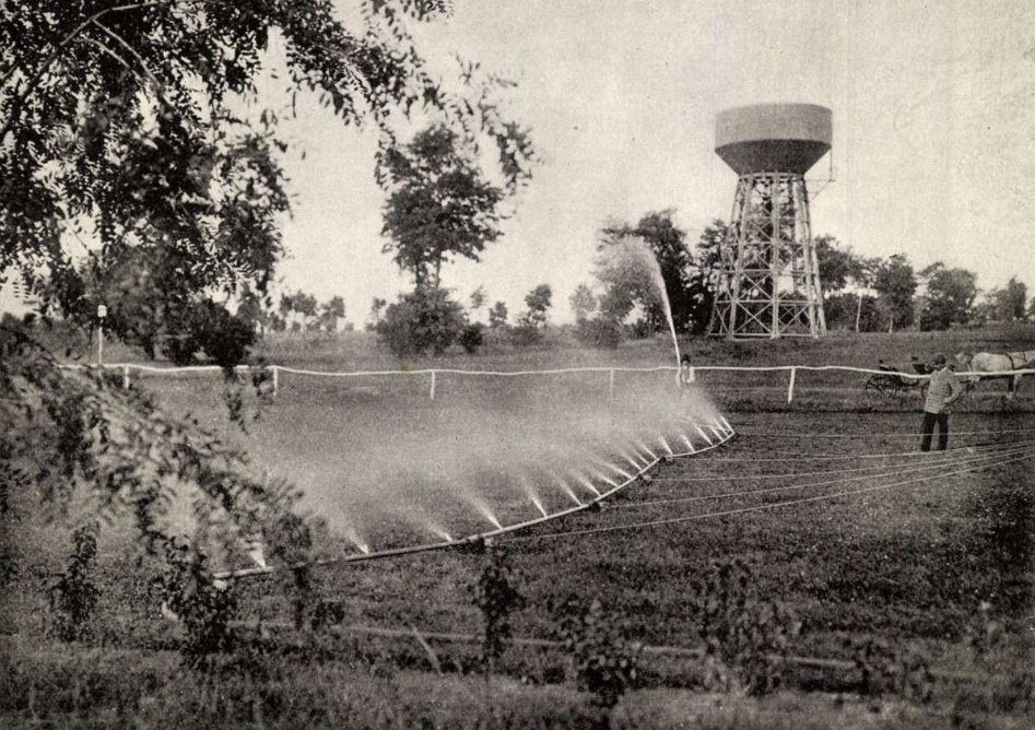 A franczia gyepöntöző-készülék, háttérben a nagy viztartóval.