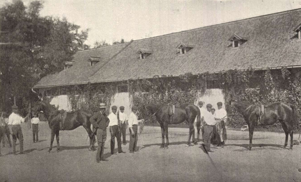 Most azután átrándultunk Geist Gáspár külön telepére, a hol csakis a Geist-lovak nyernek kiképzést, a melyek számra nézve lehetnek vagy nyolczvanan. Az alagi pálya eme népszerü istállójának ügyeit Mravik Pál, egy jókedélyü magyar ember intézi, a ki jövetelünkkor éppen hazafelé tartott jó öreg Bunkó lovával és az egész gárda lóval. Lekaptuk őket mind.