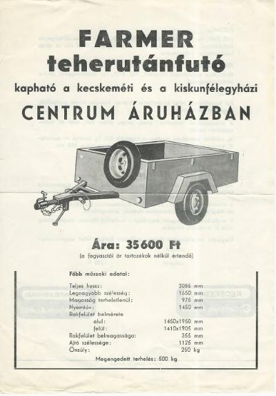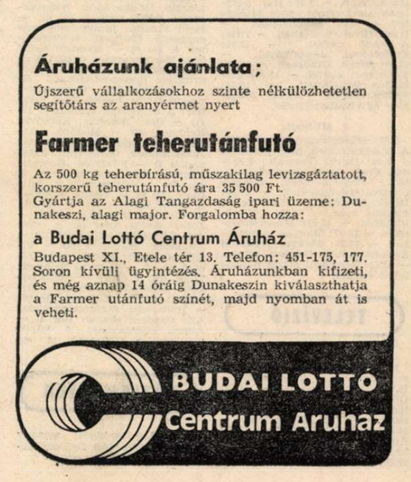 Egy 1982-es hirdetés szerint jelentősen megnövelhették a termelést, mert gyakorlatilag azonnali értékesítéssel kecsegtették a vásárlókat. „Áruházunkban kifizeti, és még aznap 14 óráig Dunakeszin kiválaszthatja a Farmer utánfutó színét, majd nyomban át is veheti.” – szólt a Budai Lottó Centrum Áruház reklámja.[14]