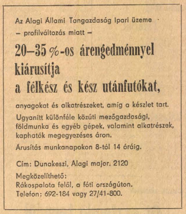 [12] Gépkocsi-utánfutók Alagról, in: Pest Megyei Hírlap, 1981/237: 5.