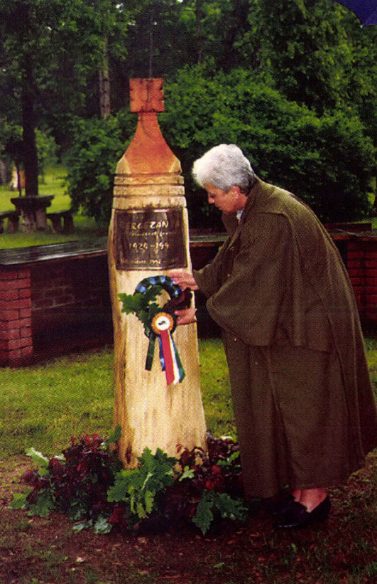 Dr. Monori Ilona koszorút helyez el az emlékoszlopon, amely Lengyel István szobrászművész alkotása