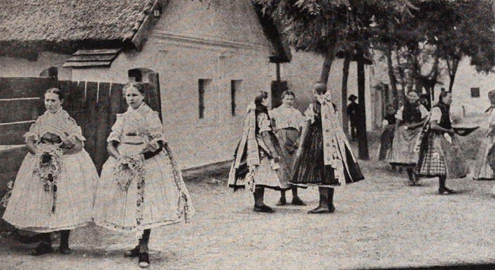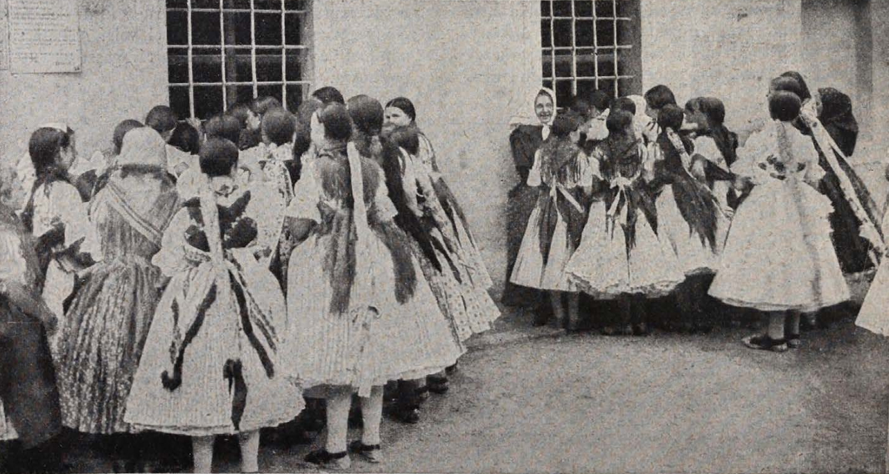 Arról azonban gondoskodnak a legények, hogy egy leány se maradjon megtánczoltatás nélkül. Az a leány, a ki már tánczolt, kimegy a teremből és helyette behívnak másikat az ablakok előtt éppen nem türelmesen várakozó leányok közül. Látjuk ezen a kedves képen, hogy a leányok papucsot viselnek s hajuk, melybe széles pántlika van fonva, le van eresztve hátul a bő szoknyájukra. Még jobban megfigyelhetjük érdekes viseletűket azon a másik dunakeszii fényképfelvételünkön, mely az egyik utczán haladó és beszélgető nőket ábrázol. A kép bal sarkában látható nők éppen a templomba igyekeznek s kis virágkoszorut és gyertyát visznek magukkal.