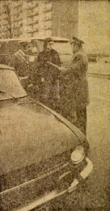 Egy szerencsés autós. Csatár Imre százados Dunakeszin adta át a járművezetőnek a rendőr-főkapitányság és a KBT [Közlekedésbiztonsági Tanács] ajándékcsomagját.