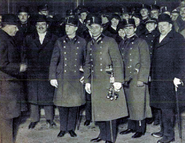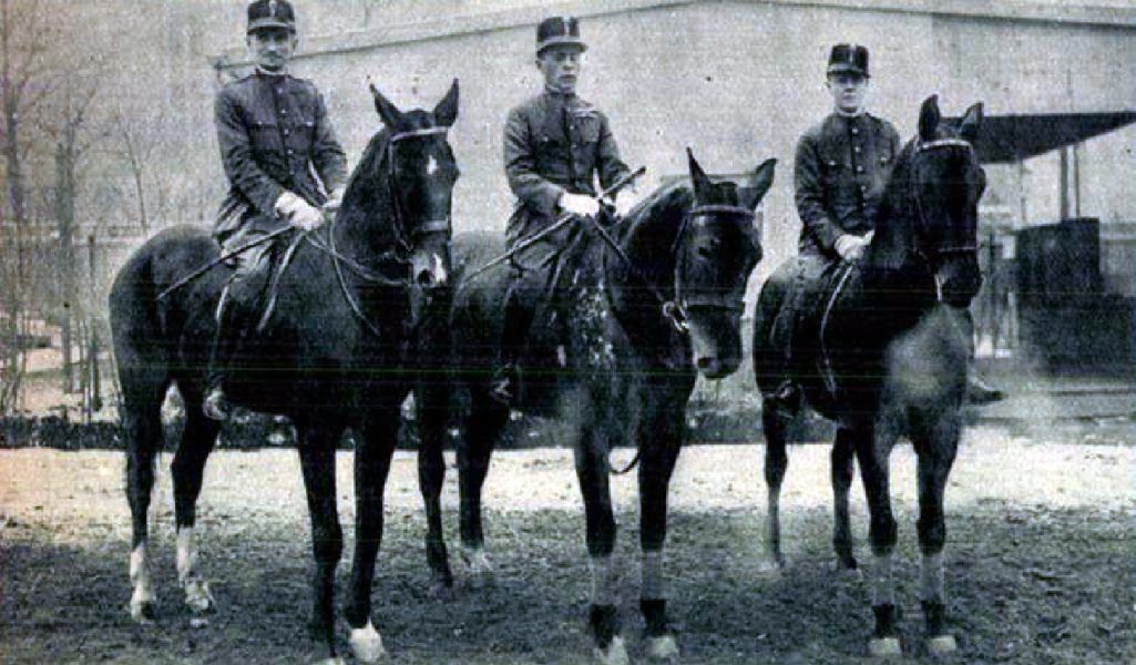 Az Amerikában nagy sikerrel szerepelt lovas-tisztjeink visszaérkezése Budapestre. Középen Manalotti ezredes, Schaurek és Endrődy főhadnagyok.