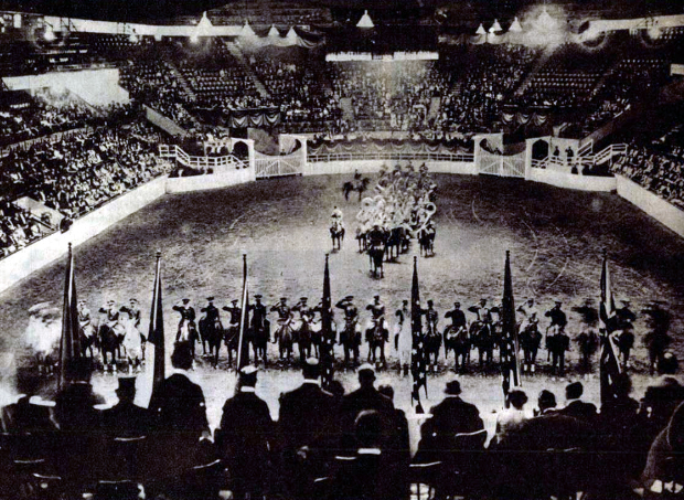 Az Egyesült Államokban, Bostonban tartott nemzetközi lovasmérkőzések megnyitó ünnepe. A mérkőzéseken Európa legjobb lovasai is résztvettek. Képünk: a versenyzők tisztelegve hallgatják a résztvevő nemzetek himnuszait. Középen a fehérlovas tiszt és a mellette levő két tiszt: a magyar reprezentánsok, Manalotti alezredes, Schaurek főhadnagy és Endrődy főhadnagy. A magyarok a versenyek harmadik helyére kerültek.