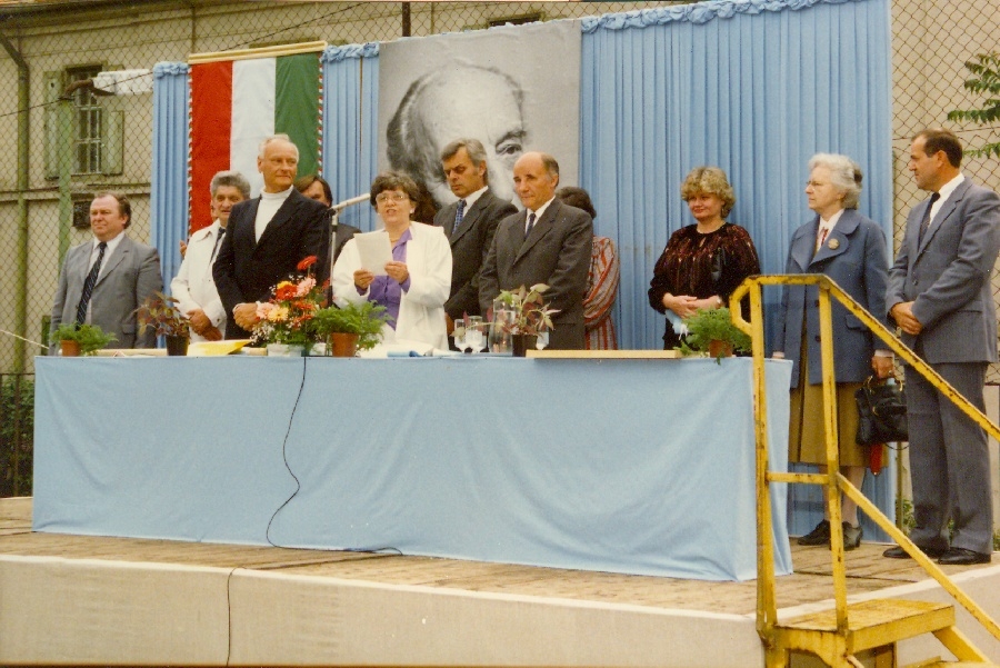 Az emelvényen jobbról: Novák István a Pest megyei művelődési osztály vezetője, Szőnyi Erzsébet zeneszerző és zeneakadémiai tanár, Tóth Istvánné a helyi Művelődési Osztály vezetője, Daróczi Bárdos Tamás tanár és zeneszerző (elsőszülött fiú), Varga Lajos a Járműjavító Üzem igazgatója, Nagy Sándorné megyei kulturális referens, Szakáll Lászlóné igazgató, Lukin László a Bárdos Társaság elnöke, Villási László városi tanácselnök.