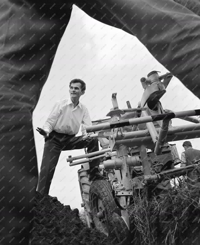 A prototípus a Herceghalmi Állami Gazdaságban. Kiss Imre szerelő és Albert István, a feltaláló a gép mellett
