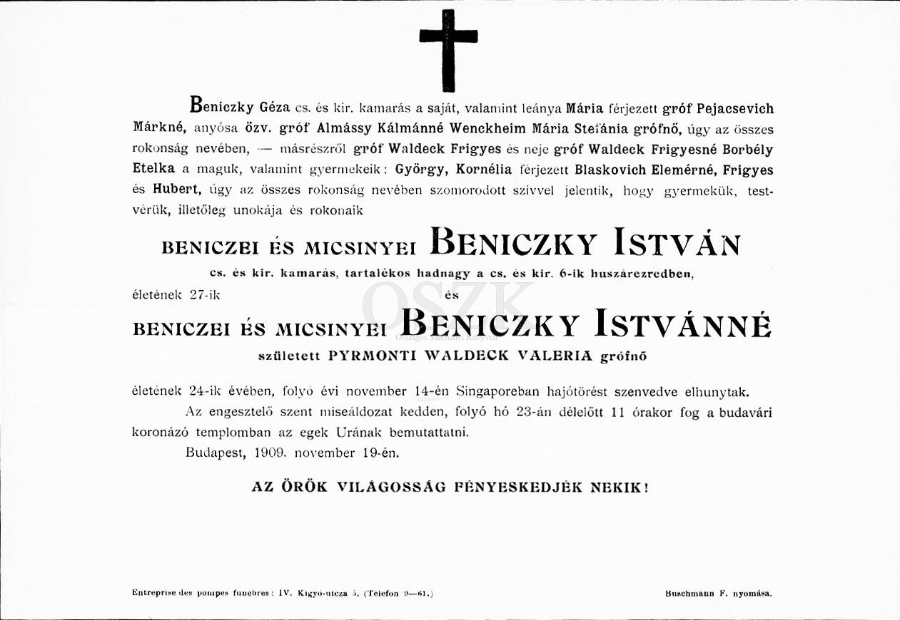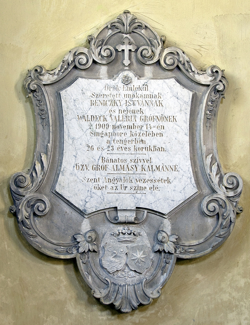 Az alagi Szent János-, más néven lovaregyleti kápolnát, három grófi család – a Pejacsevich, az Almássy és a Cziráky – adományaiból építették 1906-ban. Az épület falán két tábla emlékeztet a lóversenyzés kapcsán Alaghoz ezer szállal kötődő famíliák egykori tragédiáira. A templom- és a helytörténet mindkét eseményt kapcsolatba hozza a kápolna alapításával, holott valójában csak az egyik köthető hozzá, melynek Czirákyné gróf Almássy Erzsébet állíttatott emléket. Lánya, Cziráky Johanna 1901-ben fiatalon hunyt el, alig egy évvel az alagi gróffal, Pejacsevich Alberttel kötött házasságkötése után. A másik táblán – amely Johanna unokatestvérének, Beniczky Istvánnak és feleségének emlékét őrzi, s egyben mostani írásunk tárgya – özv. gróf Almássy Kálmánné sorai olvashatók. „Örök emlékül szeretett unokámnak, Beniczky Istvánnak és nejének, Waldeck Valéria grófnőnek, [akik meghaltak] 1909. november 14-én Singapoore közelében a tengerben, 26 és 23 éves korukban.” Az itt szereplő dátum helytelenül 1900. szeptember 14-ének írva került a történeti anyagokba, ez vezethetett a fent említett félreértelmezéshez. A szörnyű esemény valójában három esztendővel a kápolna felépítése után történt. De ki is volt a táblán említett fiatal pár, és mi történt azon – a szinte napra pontosan száz évvel ezelőtti – végzetes, távol-keleti hajnalon?