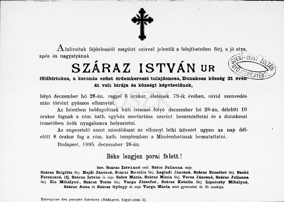 B. Száraz István, 1863-as megválasztását követően, harmincegy éven keresztül töltötte be a dunakeszi bírói tisztet. A helyi születésű gazdálkodó korábban részt vett az 1848-as szabadságharcban, ahol hősiességéért kitüntetést is kapott. Két feleségétől, Varga Erzsébettől, majd Szőcs Juliannától született tizenkét gyermeke közül tízen érték meg a felnőtt kort. Népes famíliája gyökere számos most is élő dunakeszi családnak, melyet jól szemléltet az 1895-ös gyászjelentésen szereplő névsor.