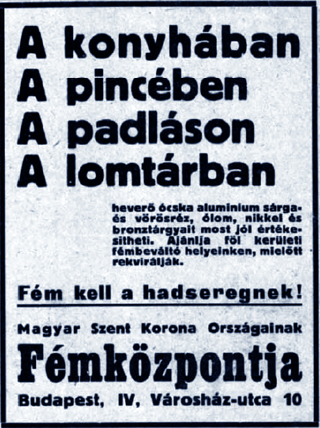A fémközpont hirdetése a Borsszem Jankó 1916. március 26-ai számában [7]