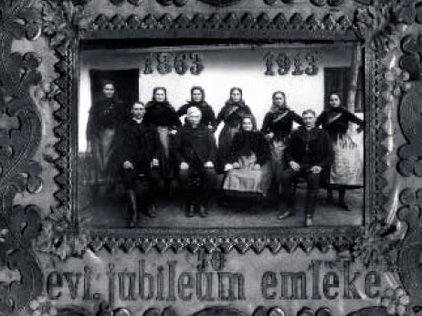 Írásom központjába a mellékelt fényképet szeretném állítani, melyet valószínűleg Kozman Ede családja keretezett be és ékesített jellegzetes dunakeszi díszítéssel. Ez az első képek egyike, amely tősgyökeres helyi paraszti családot ábrázol. Mégis, azt állítom, hogy a kép az „utolsó órában” készült. Id. László József és felesége, Száraz Veronika házasságuk 50. évfordulóján, az aranylakodalmuk alkalmából, 1913-ban hívta össze fiait és lányait, hogy az utókornak megörökítsék magukat. Az „utolsó órában”, hiszen egyrészt a családfő a következő évben elhunyt, másrészt azért, mert ez a család még a régi paraszti életformát, viseletet, szokásokat, erkölcsöt képviselte. Gyermekeik generációjában már nem játszott akkora szerepet a föld, már megjelentek azok a változások, melyeket a föld elaprózódása, a technika fejlődése kiváltottak. Vegyük szemügyre a képet! Magyaros, kissé „ázsiai” arcok, derűs, nyugodt kiállás. Hat asszony, két férfi. Aránytalannak találnánk ezt, ha az adatok nem igazolnák, hogy Száraz Veronika házasságában még négy fiúnak is életet adott: József (1865), István (1869), János (1875), Ferenc (1882). Ők azonban nem élték túl a csecsemő- ill. gyermekkort. Nézzük azokat, akik a képen vannak! A felső sorban, balról (születési évük és házastársuk nevének feltüntetésével): Rozália (l867., Holovics István), Anna (1882., Asztalos József), Mária (1871.,Vörös Lőrinc), Katalin (1873., Tarcsai András), Veronika (1886., Asztalos István), Julianna (1884., Holovics György). A két ülő fiatal férfi: József (1876., Góbis Katalin) és Mihály (1878., D. Száraz Mária). Aki ismeri a régi, helybéli gazdálkodó családokat, azonnal észreveszi, hogy módos, tisztes családokba házasodtak, még testvérpárt is választottak. Valamennyiüknek ekkor már felnőtt gyerekeik voltak, mindannyian 3-8 gyereket neveltek. Egyedül Julianna családjában nem született utód.