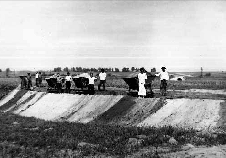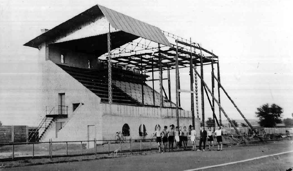 A kis képen, mely 1926-ban készült, a sporttelep részére kijelölt füves területen végzett első „kapavágásokat”, a földmunkák megkezdését láthatjuk. A nagy fénykép az 1929-ben átadott fedett tribün építését örökíti meg.