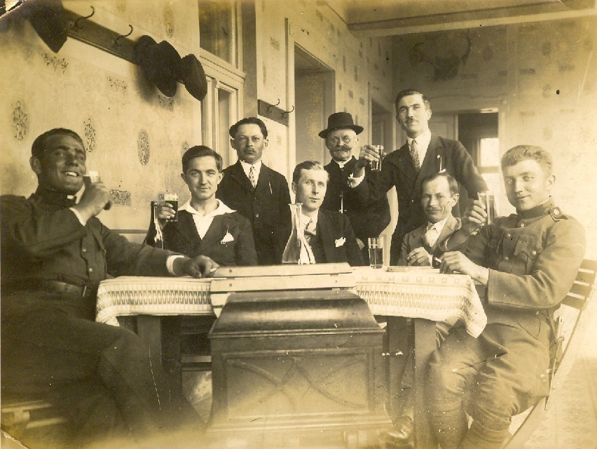 A nagy képen szabadságra hazatért katonákat ünnepelnek a Mogony kocsma verandáján. Balról a harmadik személy Sipos János, aki a MÁV Főműhelyben töltött munkaideje után rokonként a vendéglőben is kisegített.