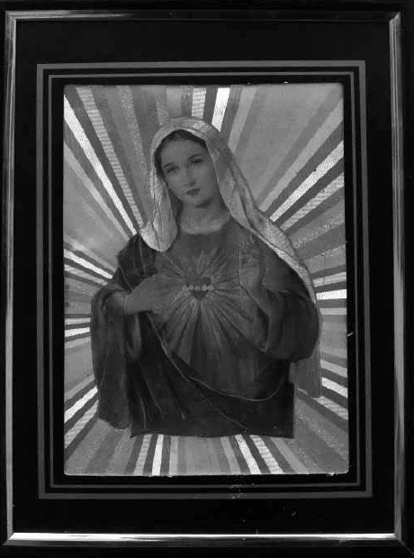 A 19. század végi, 20. század eleji dunakeszi paraszti lakóházak szakrális terének egyik fontos szentkép-típusa nem nyomtatással készült. A kiállításon több tükörre festett szentkép, úgynevezett tükörkép látható, melyen az ábrázolástól szabadon hagyott mező jól látható tükörfelület. Antik előzmények után a 14. századtól itáliai mesterek alkalmazták, majd tökéletesítették a technikát, (közbevetőleg: a tükörkép készítésnek kétféle technológiája ismert: 1. először az üveget munkálják meg, vagyis metszéssel, maratással készített díszítményekkel veszik körül a tulajdonképpeni képmezőt, majd megfestik az ábrázolást, végül foncsorozzák, vagy kormozzák. – 2. a kész tükörből kikaparják a festésre szánt részeket és ezekre készül az ábrázolás) de a népi változat Németországban alakult ki, majd a barokkban teljesedett ki. Az ábrázolások egyértelműen szentképi előképekre vezethetők vissza, a tematika hasonló a papír szentképekével. A tárgyak díszítése, a szentképet körülvevő virágmotívumok a bútorfestészet hatását mutatják. Mivel a festést iparszerűen űzték, jelentős forgalmat bonyolítva, az egyedi, művészi megformálásra nem sok idő maradt, az egyes műhelyek stílusa mégis eltérő, a technikából adódóan pedig a tükörképek (akárcsak a Dunakeszire nem jellemző üvegképek) mégis rusztikus bájt árasztanak. A tükörképek német, osztrák, sziléziai és dél-cseh műhelyekben készültek, jellemzően a 19. század második felében. Magyarországra főleg cseh áru került és különösen a sváb lakosságú falvakban volt gyakori. Dunakeszire a műhelyek által foglalkoztatott házaló árusok hozták.