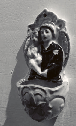 A szenteltvíz tartására szolgáló edény paraszti háztartásban többnyire cserépből készült, de előfordult ónból és üvegből való is. A 19. század vége óta mindezeket a polgári ízlést tükröző gyári készítésű porcelán szenteltvíztartó szorította ki. Helye a szobai ajtó mellett volt, a falra akasztva. Falra akasztható lapja alsó részéhez félgömb vagy kehely alakú, csúcsban végződő víztartó tartozik. Lapja felül átlyukasztott, felülete domborműves díszítésű, feszület, vagy keresztábrázolással, Mária és a gyermek Jézus, szentek, hitremény- szeretet allegória, vagy őrangyal ábrázolásával.