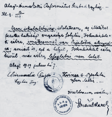 Ahhoz képest, hogy április 13-án még a honvédségtől kellett igazolást kérni személyazonosságáról és egy április 29-i keresztelést kérő levél így kezdődhetett: „Kedves Lelkész Elvtárs!”, 1919 júliusában, a kommün gyengülésével már kedvezményeket is ki tudott csikarni az alagi direktóriumtól: „Ezen iskolahelyiség, iskolaterem az illetékes felettes hatóság engedélye folytán Istentiszteleti célra, imateremnek van kijelölve, átengedve; amiért is ezt a helyet Istentiszteleti célon kívül más célra lefoglalni nem lehet. Alag, 1919. július hó 7. Csizmadia Lajos egyház tag, Kirner A. Bertalan reform. lelkész. Direktórium nevében: Straub Károly.”