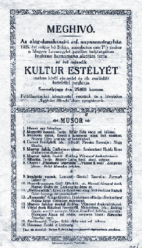 „MEGHÍVÓ – Az alag-dunakeszi ref. egyház önállósíttatván egyházi törvények szerint Nagytiszteletű Nagy Ferenc e.m. esperes úr f. hó 20-án vasárnap d.e. 10 órakor iktatja be az alagi községháza tanácstermében első rendes lelkészét Kirner Bertalant. Erre az egyházi ünnepélyre, az azt déli egy órakor a Hámor-féle vendéglőben követő közebédre t. Címet és b. Családját tisztelettel meghívja az egyházi tanács. Egy teríték ital nélkül 100 kor.”