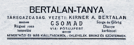 A tiszteletes úr rendszeresen járt kis szekerén az OFB (Országos Földosztó Bíróság) tárgyalásaira, hogy egyházának és családjának egy kis földecskét szerezhessen. Az egyik fóti községi tanácstag mondta egyszer: „ha az alagi egyház esetleg tényleg földhöz jut, azt ennek a kis lónak is meg kell köszönnie, amely a tiszteletes urat mindenhová, minden OfB tárgyalásra elviszi.” (Végül ez a kis ló is árverés, majd per „alanya” lett, csak 1945 után kárpótolták miatta Kirner urat.) Az alagi gyülekezet végül Csomád határában kapott 15 hold „nagyon jó helyen levő, értékes földet”. Ezt a kis földet Kirner nagy szeretettel gondozta, így megtermelte egyháza és családja javára a szerény megélhetést. 1921-től 1926- ig gazdasági naplót vezetett, mely ma is megtalálható a Sárospataki Akadémia könyvtárában. 1960. február 29-én, mielőtt átadta volna a könyvtárnak, ezt írta bele: „Lelkészi életem keresztmetszetje. Egyház nem volt; templom, imaház – nem volt. Alag, gróf Károlyi utca 13 számú házat vettem meg. Abból indult ki az alag-dunakeszi ref. egyház. Ott volt az első minden irányú összejövetel. Ez a napló is egyik kezdete a tanítói- gazdálkodó- állattenyésztő- egyházi-birtok szerző, stb. irányú szorgoskodásomnak.” A csomádi földeken gabona- és zöldségtermesztésen kívül állattartással is foglalkoztak. 1927-ben Kirner Bertalan a Hússertéstenyésztők Országos Egyesületének, majd 1928-ban a Baromfitenyésztők Országos Egyesületének is rendes tagja lett. A csomádi egyházbirtokra jegyeztette be vállalkozásait is, melynek levélpapírján ez áll: „BERTALAN-TANYA – Társgazdaság. Vezeti Kirner A. Bertalan – Csomád”