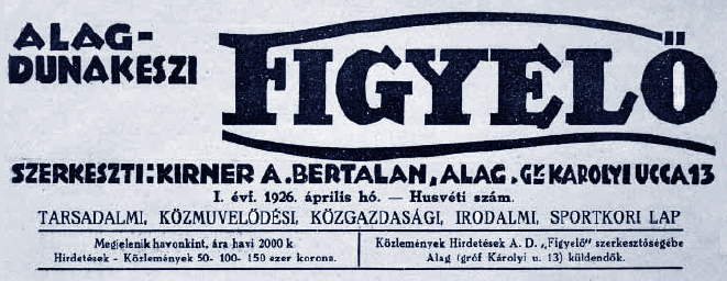 Február 20-án megjelent az Alag–Dunakeszi Figyelő I. évfolyamának első száma, amelynek fejlécéről megtudhatjuk: „Megjelenik havonta, ára havi 2.000 korona. Szerkesztő Kirner Bertalan.” Az Ablak a házon! című vezércikkben így ír a lelkész az új „ablakról”: „Jöjjön mindenki és figyelje az eseményeket. Kopogtasson, szóljon be rajta. Hozza azt, amire szüksége van neki és embertársainak. Ez a »Figyelő« olyan szükséges ablak, melyen levegő áramlik át, hogy szolgálja társadalmi életünk egészségét.” A lapszám színes híreket is közölt községünk életéből. Visszaemlékezett a karácsony esti ünnepélyre, ahol gróf Pejácsevich Albertné Almássy Irma grófnő adománnyal örvendeztette meg a szegényeket. Negyven gyermek kapott cipőt, ruhát, élelmet. Az ünnepségen beszédet mondott az új lovaregyleti lelkész, Hoitschy L. Pál, és a jelenlévők között ott volt Hajnal Jenő főjegyző, Molnár Gyula bíró, Závodszky Géza jegyző, Kleiszner László mérnök és Romeiser Vilmos felügyelő. A szerkesztő írt Schejbál József zsoké és Kaposi Gizike esküvőjéről, Horthy Jenő afrikai elefántvadászatáról, az új dunakeszi plébános, dr. Lakatos Kálmán első szolgálatairól, a református egyház karácsonyi ünnepségéről, Czukkelter Gábor állomásfőnök Óbudára történő előléptetéséről, s Rácz Lilike zongo- raművésznő olaszországi fellépéséről is. Az alagi római katolikus lelkész, Hoitschy L. Pál egyházközségéről így ír: „A kápolnához szép úton sétálva járni, ott istentiszteletet hallgatni, tetejében még egyházi adót sem fizetni, az alagi római katholikus hívek paradicsombeli állapota, amelyhez hasonlót sehol e hazában találni nem lehet.” Megemlíti a MÁV-műhelytelepet mint Dunakeszi egyik új nevezetességét, valamint szól a szükséges útépítésekről is. A mezőgazdasági tevékenységekkel kapcsolatban jelzi, hogy „a paradicsom termelés az utóbbi időben nem fizeti ki magát úgy, hogy abból a gazda egész évre való ellátást biztosíthassa, mert már a távolabb levő gazdaságok is ontják a paradicsomot.” Ezért Arany Sándor táblabíró, alagi birtokos felvetette, hogy kifizetődő lenne áttérni a paprikatermelésre. Szakemberekben sem lenne hiány, Örményi István, Kleiszner Károly, Fürst Sándor, Humbolszky László szakvéleményére támaszkodva jó eredmények várhatóak. Végül beszámolók következnek a jogászok, a jegyzők, az Alagi SC, az iparos kör, a lovaregylet, valamint a Levente Egyesület farsangi báljairól és az ágostai hitvallású evangélikus lutheránus- kálvinista estélyről. „A dunakeszi önkéntes tűzoltó testület mulatsága is élénk volt. Sajnálatos dolog azonban az, hogy a falusi mulatságokon valami kellemetlen incidens mindég előadja magát s gyakran molesztálják a beköltözött lakosokat a bennszülöttek, a maradi szokást, lassan-lassan, az értelmesebb elemek közbe lépésére le kell vetkőznie a falusiaknak is […] a Farsang elmúlt – vidámság, gyönyörűség bőséges volt. Most tartsunk böjtöt és látogassuk a templomokat is.”