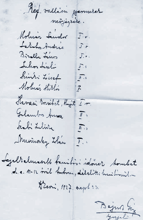 A dunakeszi katolikus iskola református növendékeinek névsora