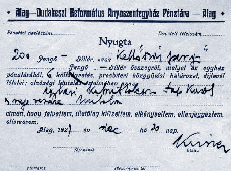 Az 1926-os évben nem tértem ki részletesen az egyház pénzügyi nehézségeire, legyen elég erre a következő végzés: „[…] elrendeli, hogy a tkvi iroda a jelzálogot 30.000.000 Kor. váltóhitel tőke, ennek 1926. évi október hó 14. napjától járó 12% kamata késedelmes fizetés esetén s a tőke után fizetendő havi 1,5% és 6.000.000 Kor. költségbiztosíték erejéig az alagi 90. sz. tkvi betétben A-1 sorszám alatt foglalt Alag-Dunakeszi református egyház nevén álló ingatlanra s ennek tartozékaira és haszonélvezetére a Váci Takarékpénztár váczi bej. cég javára kebelezze be.” Ezt követően Őry Lajos veresegyházi lelkész, pénzkezelő tájékoztatta Kirner Bertalant az elmaradt nyugdíj- és közalapi járulékokról, összesen 17 millió korona tartozásról. Végül a község is jelentkezett 1,2 millió korona adóhátralék nyolc napon belüli befizetését kérve.