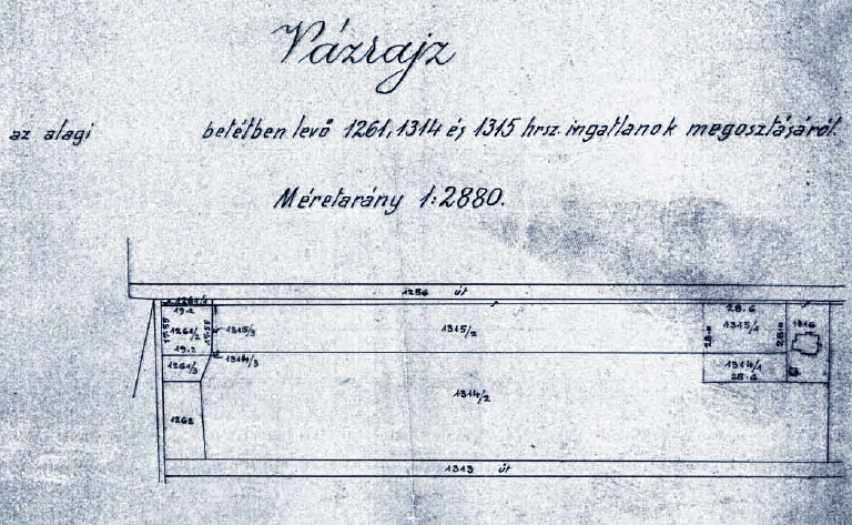 A Horthy Miklós (ma Fóti) úti telek megosztásáról készült korabeli vázrajz. A telek jobb felső sarkában látható a református templom részére kijelölt 1315/1 és 1314/1 számú rész. (Mellette 1316 helyrajzi számmal Bayer Emil alagi orvos telke és háza található.) A telek bal felső sarkában az evangélikus egyház részére átadott 1261/2 és 1261/3 számú birtokrész, amelyen az evangélikus templom felépült.