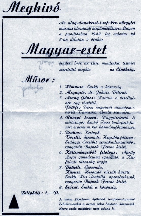 Március 8-án a Pavilonban Magyar-estet rendezett a nőegylet, melyen egy illusztris vendég is fellépett. „Költeményeiből felolvas: Áprily Lajos gimnáziumi igazgató, a Kisfaludi társaság tagja.” [Áprily (Jékely) Lajos (1887–1967) költő, műfordító, a Baár– Maddas Leánynevelő Intézet igazgatója.]