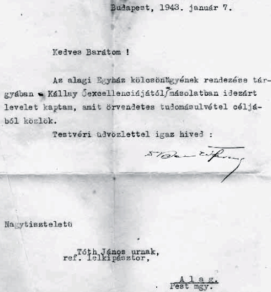 Egy vegyesházassággal kapcsolatos levélből: „Tekintetes Pálfi Gyula úrnak, Alag, Nándormajor. Kedves Testvérünk! Arról értesültünk, hogy egy kath. vallású nővel óhajt házasságra lépni. Aug. 25-én történt a polgári anyakönyvvezetőnél a kihirdetés. Templomunkban ellenben nem hirdettette ki azt. Így arra kell következtetnünk, házasságát nem szándékozik templomunkban megáldatni, sőt születendő gyermekeit is átengedi a menyasszony hitére. […] Szálljon magába testvérünk és neveltesse születendő gyermekeit a ref. vallásba. A szentírás tanítása szerint nincs az anyaszentegyháznak a tőle elpártoltakkal semmi közösségünk. Tisztelettel Tóth János lelkipásztor.”