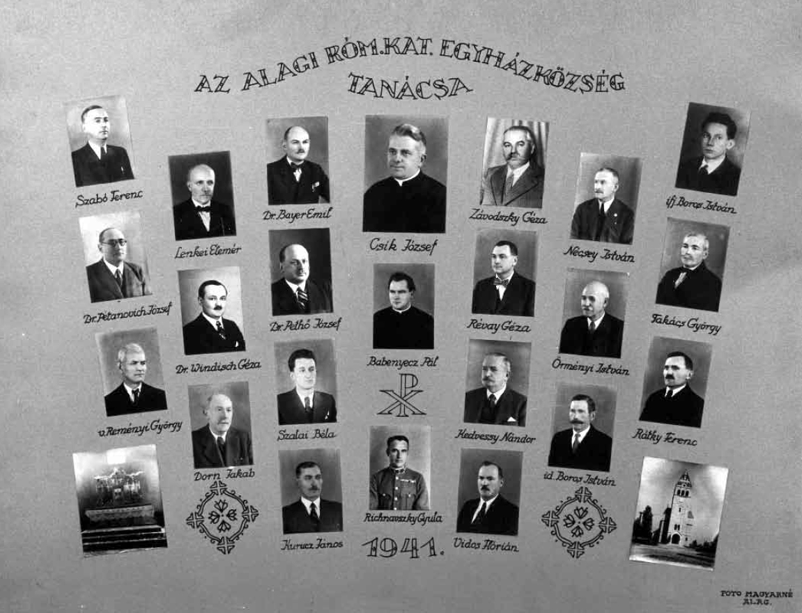 A képen az egyházközség tanácsának tagjait ábrázoló 1941-es tablót láthatjuk. Fő helyen szerepel Csík József plébános fotója, aki 1945-ig állt az alagi hívek szolgálatában. Körülötte a tanácstagok mind-mind Alag vezetői vagy jelentős személyiségei. Závodszky Géza, a község vezető jegyzője, aki épp 1941-ben került át a szomszédos Dunakeszire, és vette át az ottani főjegyzői hivatalt; dr. Bayer Emil községi orvos, aki hivatalos teendői mellett a helyi önkéntes tűzoltóegyesület parancsnoka is volt; Kedvessy Nándor, a Pavilon egykori bérlője, a messze földön híres Kedvessybélszín megalkotója; Lenkei Elemér, akit 1943-ban Alag bírájának választottak; dr. Petanovics József, a híres szállodás fia, a község ikonikus „figurája”, ki szenvedélyes fotós révén több száz képen örökítette meg a harmincas-negyvenes évek Alagját; Örményi István, községi törvénybíró, az egyházközség tanácsának pénztárosa; dr. Pethő József körállatorvos, vagy Kurucz János valamint idősebb és ifjabb Boros István községi képviselők.