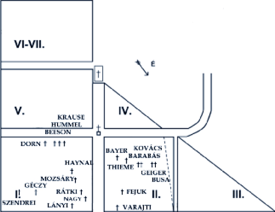 A temető vázlatos térképe a bemutatott sírokkal