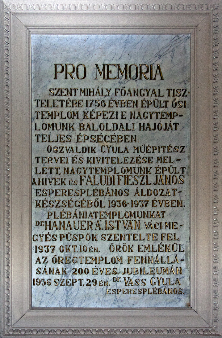 A Szent Mihály-templom főhajójában találjuk a templom egykori plébánosainak emléket állító emléktáblát, amelyet a templom felszentelésének 250. évfordulója alkalmából állítottak.
