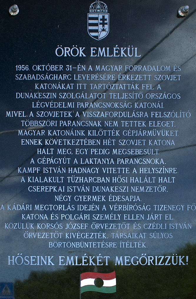 Kiérve a Fő útra a Temető út és a Fő út sarkán, az egykori Kardos-pékség falán található az 1956-os forradalom és szabadságharc legfontosabb dunakeszi ese-ményét felidéző emléktábla, mely az akkor történteket pontosan örökíti meg: „Örök emlékül. 1956. október 31-én a magyar forradalom és szabadságharc leverésére érkezett szovjet katonákat itt tartóztatták fel a Dunakeszin szolgálatot teljesítő Országos Légvédelmi Parancsnokság katonái, mivel a szovjetek a visszafordulásra felszólító többszöri parancsnak nem tettek eleget, magyar katonáink kilőtték gépjárművüket. Ennek következtében hét szovjet katona meghalt egy pedig megsebesült. A gépágyút a laktanya parancsnoka, Kampf István hadnagy vitette a helyszínre. A kialakult tűzharcban hősi halált halt Cserepkai István nemzetőr, négy gyermek édesapja. A kádári megtorlás idején a vérbíróság tizenegy fő katona és polgári személy ellen járt el. Közülük Korsós József őrvezetőt és Czédli István őrvezetőt kivégezték. Társaikat súlyos börtönbüntetése ítélték. Hőseink emlékét megőrizzük.”