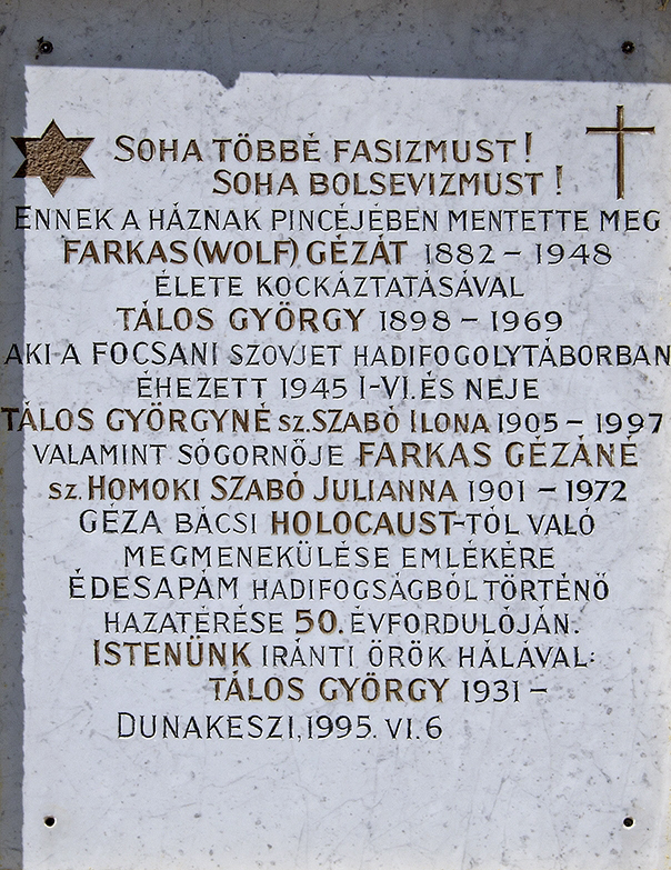 A Fő út 124. számú ház udvar felé eső falán található Tálos György emléktáblája. Az emléktábla Farkas (Wolf) Géza holokauszttól való megmenekítésének és Tálos György szovjet fogságból való megmenekülésének állít emléket: „Soha többé fasizmust! Soha többé bolsevizmust! Ennek a háznak a pincéjében mentette meg Farkas (Wolf) Gézát 1882-1948 élete kockáztatásával Tálos György 1898–1969 aki a focsani szovjet hadifogolytáborban éhezett 1945 I-VI. és neje Tálos Györgyné sz. Farkas Ilona 1905–1997 valamint sógornője Farkas Gézáné sz. Homoki Szabó Julianna 1901–1972 Géza bácsi holokauszttól való megmenekülése emlékére édesapám hadifogságból történő hazatérése 50. évfordulóján. Istenünk iránti örök hálával: Tálos György 1931–. Dunakeszi, 1995. VI. 6.”