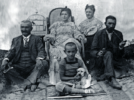 Az alagi ház udvarán. A karosszékben Zaphiry Heléna, jobbra pipával Nagy Géza, elöl Újházy György ül „Pici” kutyával