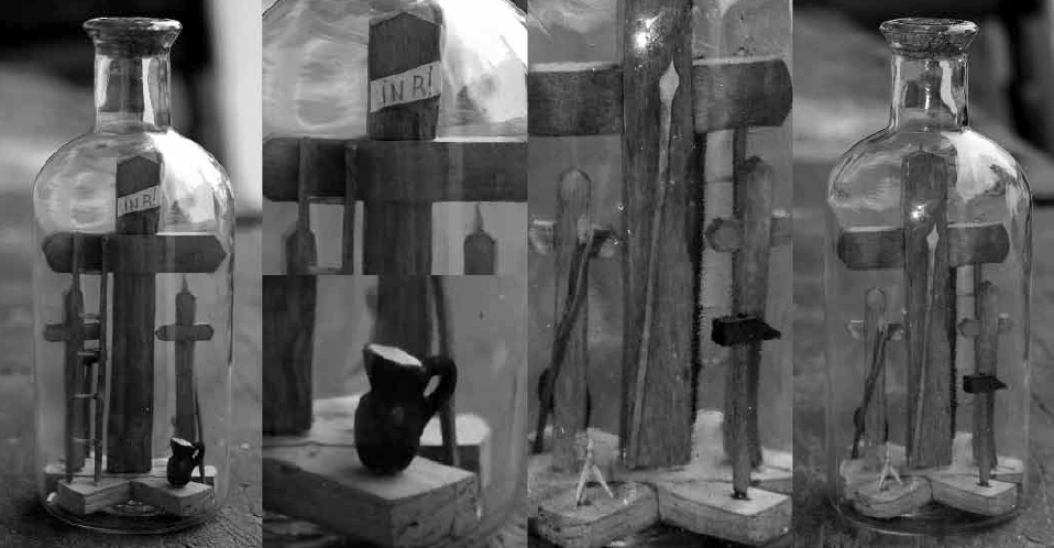 R. Cs. türelemüvege 1935-ben készült, és Szabó Józsefné (sz. Rózsahegyi Julianna) ajándékaként került a gyűjteményünkbe. A felhasznált üveg típusa elterjedt volt a magyarországi készítők körében: 200 milliliteres, gyógyszeres üveg, szélessége 6, magassága 14,5 cm, súlya 0,148 kg. Témája is tipikusnak mondható. A vallásos türelemüvegek nagy csoportja Golgota-ábrázolást tartalmaz. R. Cs. türelemüvegében a Golgotán felállított három kereszt látható. A legnagyobb felirata INRI (= Iesus Nazarenus Rex Iudaeorum = Názáreti Jézus, a zsidók királya). Az üvegben elhelyezett többi tárgy Krisztus fegyverei (arma Christi), vagyis a szenvedés eszközei közül került ki, amely fogalom a Krisztus elárulásával, megkínzásával és megfeszítésével kapcsolatos tárgyakat takarja. R. Cs. türelemüvegében a kalapács, a szögek és a legnagyobb kereszt hátoldalához támasztott lándzsa található. Helyet kapott még egy korsó is.