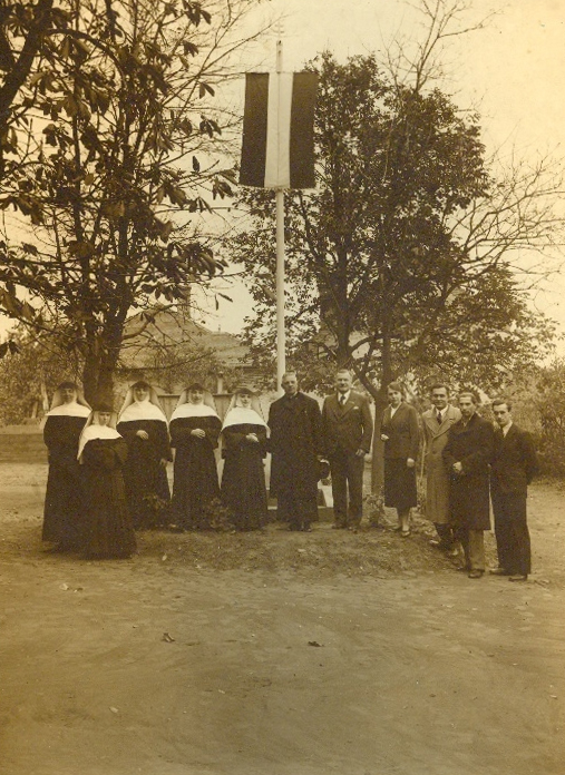 Az első kép 1938-ban készült a Római Katolikus Elemi Iskola (ma Szent István Általános Iskola) udvarán, az országzászló avatásán. Az országzászlókat leginkább iskolák közelébe emelték, hogy a gyerekek, fiatalok ezek tövében emlékezzenek meg a trianoni békediktátum Magyarországot romboló következményeiről. A zászló előtt az akkori tantestület áll. Balról a kalocsai Miasszonyunk Iskolanővérek, Amaranta, Krizasztroma, Auxélia, Hiacinta és Kapisztrána, mellettük Fiszl (Flaudi) János plébános, Bajnok Géza főkántor-tanító-igazgató, Tóth Mária tanítónő, Pandúr József, Drumár László és Szakáll László kántortanítók.