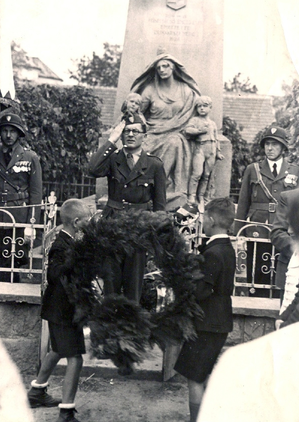 A következő két kép az 1938-as helyi megemlékezéseken készült. Az első a hősi emlékmű megkoszorúzását örökíti meg. A koszorúzási ünnepségen az Országos Frontharcos Szövetség dunakeszi-alagi főcsoportjának tagjai állnak őrséget. A szövetség célja volt az első világháború egykori magyar tűzharcosai között ápolni és tovább fejleszteni a hazafias alapon nyugvó bajtársias szellemet.