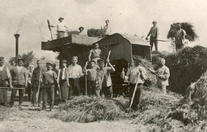 A nagy képen a gőzgép előtt balról Szabó István egyik fia, Ferenc, a kép közepén pedig sötét ruhában és kalapban maga a tulajdonos, az ún. gépesgazda, Szabó István áll.