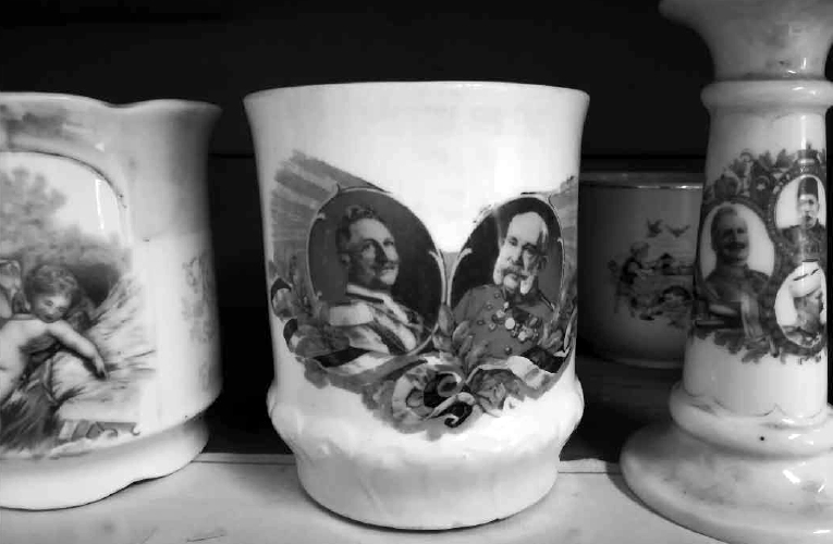 A Révész István Helytörténeti Gyűjteményben található, első világháborús, propagandacélokra készült porcelánbögrén két arckép van: a bal oldali II. Vilmos porosz királyt (1888−1918), a jobb oldali I. Ferenc József osztrák császárt, magyar és cseh királyt (1848−1916) ábrázolja. A bögre felirata nehezen olvas­ható: Háború emlékére, 1914/16. A bögrék is a háborút, az ab­ban részt vevő uralkodókat stb. népszerűsítették, így kerültek számos polcra, kredencre pl. Dunakeszin is. A formába préselt, szabadkézzel vagy sablon segítségével festett, matricával, illetve levonóképpel és olcsó aranyozással, tömeggyártásban készített edények elsősorban a háborús szövetséget és fegyverbarátságot jelenítették meg.
