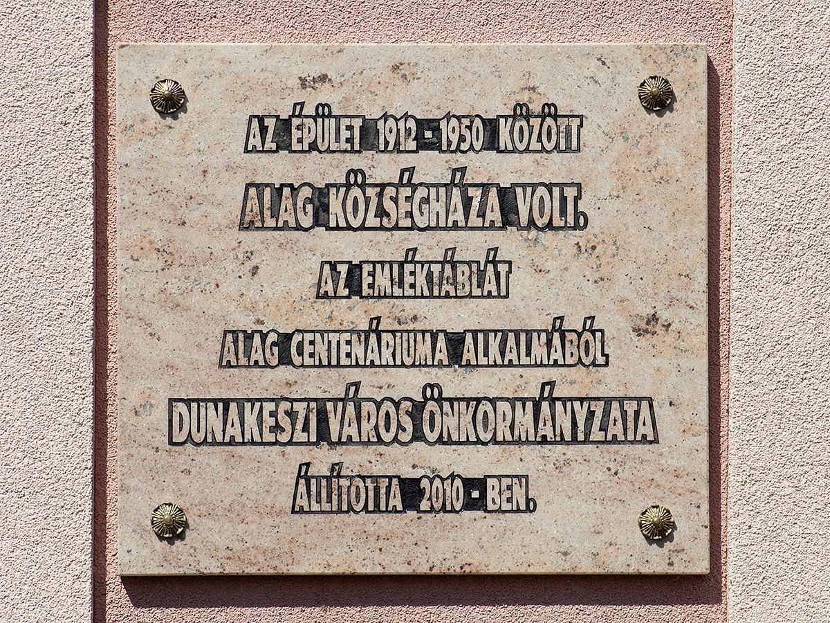 A Széchenyi István Általános Iskola udvarán, a régi községháza falán található az egykori alagi községházára emlékező tábla. Alag 1910-ben lett önálló község. Már az első évben döntés született egy önálló községháza felépítéséről. Az épületet Goldberg Simon tervezte és építette 1911-1912-ben. Az emeletes épületben a földszinten hivatali helyiségek, az emeleten a jegyző lakása foglalt helyet. Az emléktábla szövege: "Az épület 1912-1950 között Alag községháza volt. Az emléktáblát Alag centenáriuma alkalmából Dunakeszi Város Önkormányzata állította 2010-ben."