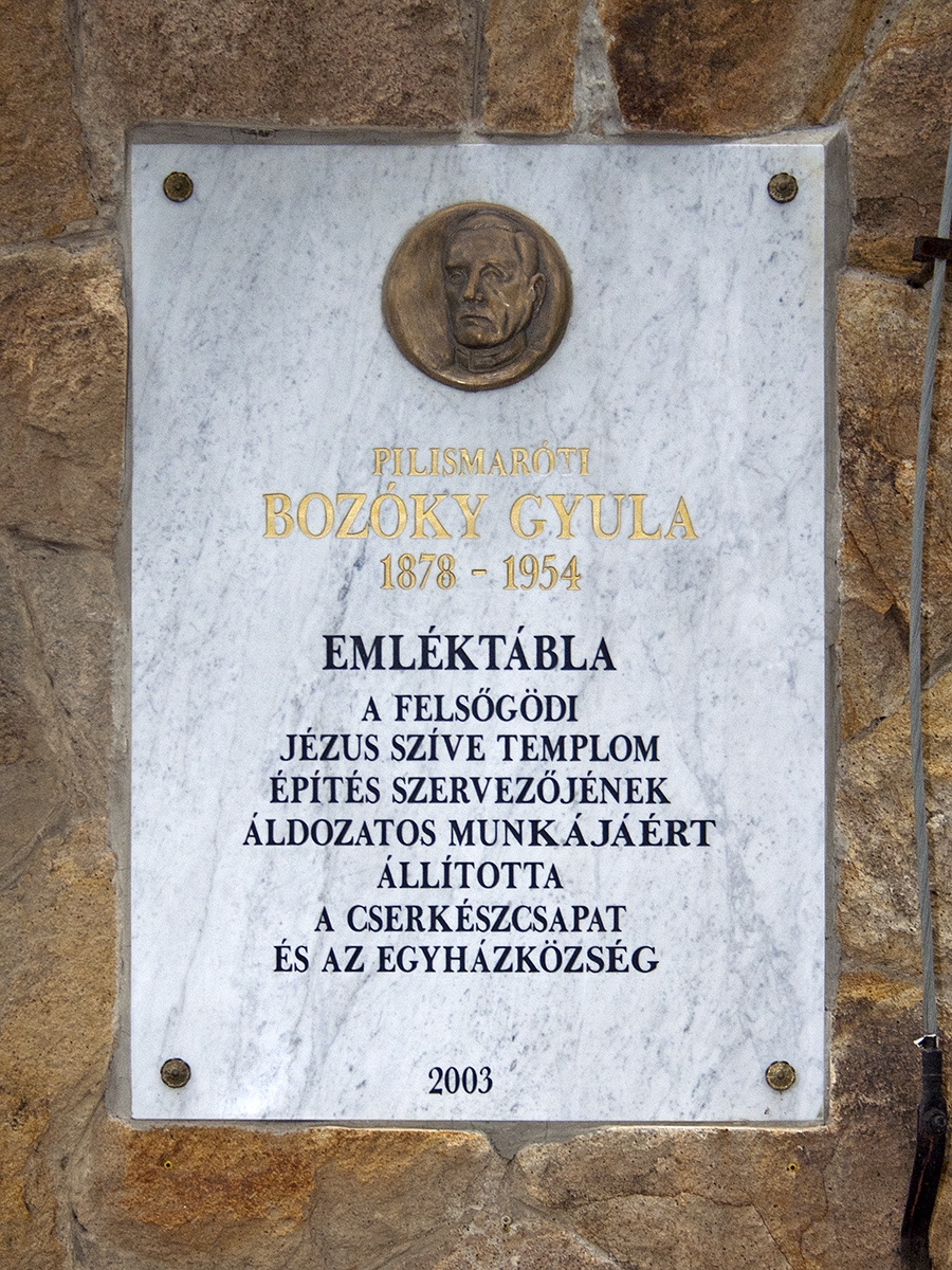 A felsőgödi Jézus Szíve templom falán találjuk a templom építőjének, Bozóky Gyulának az emléktábláját. Bozóky hétgyermekes családban született Nagyváradon. A tehetséges fiú a katonai pályát választotta életcélul. A Ludovika Akadémia elvégzése után 1900-ban avatták hadnaggyá. Ezután a bécsi Kriegsschuléban folytatta tanulmányait, ahol vezérkari képesítést szerzett. 1916-ban vk. (vezérkari) őrnagyi rangban az erdélyi honvéd-kerület vezérkari főnöke lett Siegler Konrád, a későbbi vejének fivére mellett. Ebben a minőségében saját felelősségére addig halasztotta a petrozsényi bányász sztrájk résztvevőire statáriálisan kimondott halálos ítélet végrehajtását, amíg a kegyelmi döntést ki nem eszközölte, számukra. 1908-ban megnősült, feleségül vette Mártonffy Gabriellát. A házasságból négy gyermekük született, György, László, Erzsébet és Gabriella. A háborút követően, sőt még a trianoni döntés után is egy ideig családjával együtt a románok által meg szállt Nagyváradon maradt. Mivel nem akart fölesküdni a román államra, nyugdíjazását kérte az immár vezérkari ezredessé kinevezett katonatiszt. Ettől kezdve, tehetségét kihasználva kézzel írt és színesen illusztrált könyvek, eladásával biztosította a család megélhetését. Sok egyéb mellett több szép bőrkötésű rézcsatos imakönyvet is készített, elsősorban a család tagjai számára. Egy abból az időből származó, díszes kézzel írt és festett képekkel, iniciálékkal ékesített "János vitéz" feldolgozása ma is a család birtokában van. Apja halála után, – a családnak a helybeli hatóságokkal történt összetűzését követően 1922-ben eladták a nagyváradi házat, a szépen gondozott kertet és a csonka Magyarországra költöztek a frissen vásárolt felsőgödi családi házba. Bozóky Gyula mély vallásossága következtében számtalan egyházi mozgalomból kivette a részét. Sok katolikus rendezvény szónoka, rendezője, aktív résztvevője volt. Legnagyobb és egyben a legmaradandóbb műve mégis a felsőgödi Jézus Szíve templom megvalósítása volt. Pénz nélkül pusztán akarata, hite, szervező képessége és nem utolsó sorban kiváló kapcsolatai birtokában fogott neki a nagy vállalkozásnak. Bozóky meglehetős szegénységben, hosszú szenvedés után a 76. születésnapján (1954. április. 6.-án) Felsőgödön halt meg. Nevét ma az emléktábla mellett tér is megörökíti, melyen az általa megálmodott templom is áll. Az emléktábla szövege: "Pilismaróti Bozóky Gyula 1878-1954 emléktábla. A felsőgödi Jézus Szíve templom építés szervezőjének áldozatos munkájáért állította a cserkészcsapat és az egyházközség. 2003."