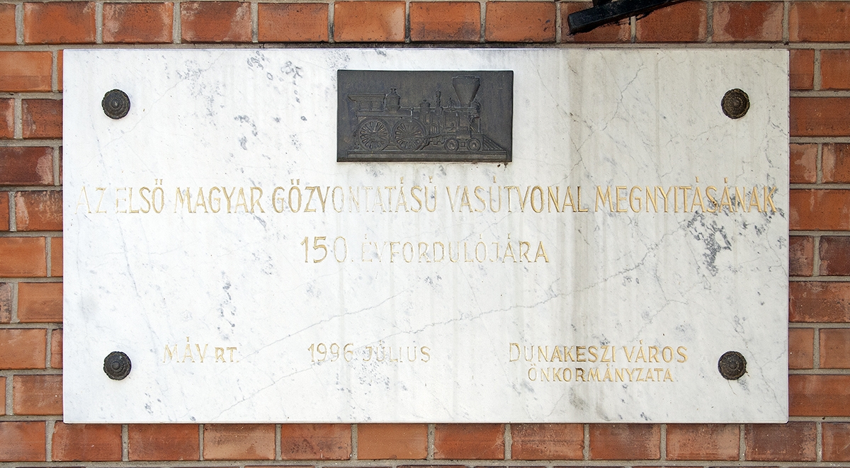 A Dunakeszi vasútállomás forgalmi épületének falán találhatjuk az első magyarországi vasútvonal tiszteletére avatott emléktáblát. Már az 1836/37-es országgyűlés törvényt hozott az első magyarországi vasútvonal megépítéséről. Több terv is versengett a megvalósításért, végül 1844-ben a Magyar Középponti Vasúttársaság kapott engedélyt az építkezésre az Ausztria-Marhhegg-Pozsony-Érsekújvár-Vác-Pest vonalon. Az építkezés 1844 őszén indult él a Pest és Vác közötti szakaszon. A próbamenetet 1845 novemberében tartották Pest és Palota között József nádor jelenlétében. Az első menetrend szerinti vonat 1846. július 15-én délután 4 órakor indult el Pestről 350 utassal. A vonat Palotán megállás nélkül haladt tovább, majd Dunakeszin 10 percet állt, hogy vizet vegyen fel. Az utazás összesen 59 percig tartott Vácig. Az emléktábla szövege: "Az első magyar gőzvontatású vasútvonal megnyitásának 150. évfordulójára. MÁV Rt. 1996 július. Dunakeszi Város Önkormányzata."
