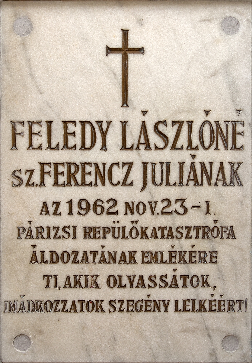 A felsőgödi Jézus Szíve templomban, a Szűz Mária kápolna oltára mögött, számos hála adó tábla szomszédágában található Feledy Lászlóné emléktáblája. Feledy Lászlóné a templom híveként szenvedett halálos repülőbalesetet 1962-ben. Erre emlékezik a tábla. Az emléktábla szövege: "Feledy Lászlóné sz. Ferencz Júliának az 1962. nov. 23-i párizsi repülőkatasztrófa áldozatának emlékére Ti, akik olvassátok, imádkozzatok szegény lelkéért!"