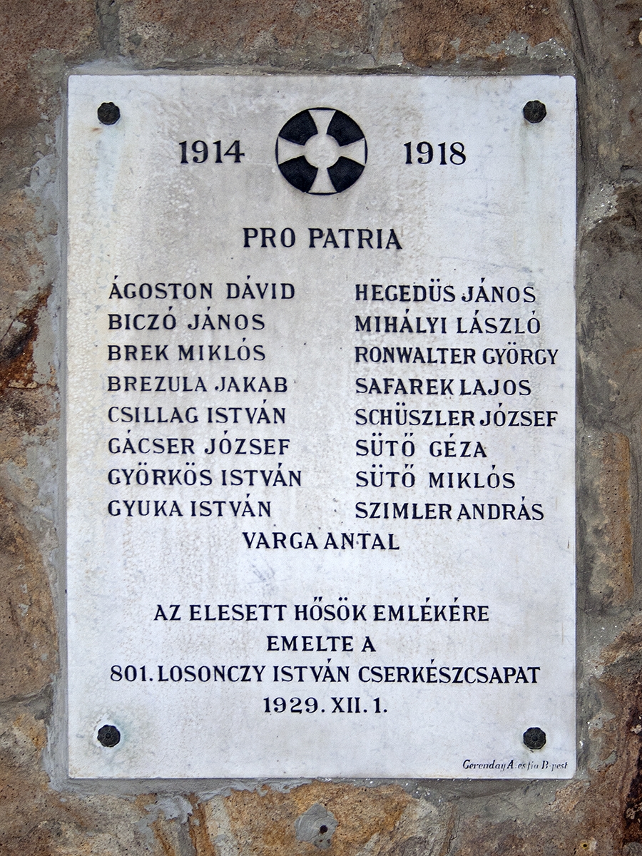 Gödön, a felsőgödi római katolikus templom oldalfalán találjuk a Felsőgödön az I. világháborúban elesett hősi halottak emléktábláját. A márvány emléktáblát a 801. Losonczy István Cserkészcsapat állította 1929-ben. Az emléktábla szövege: "1914 1918 Pro Pátria, Ágoston Dávid, Biczó János, Brek Miklós, Brezula Jakab, Csillag István, Gácser József, Györkös István, Gyuka István, Hegedüs János, Mihályi László, Ronwalter György, Safranek Lajos, Schüszler József, Sütő Géza, Sütő Miklós, Szimler András, Varga Antal. Az elesett hősök emlékére emelte a 801. Losonczy István Cserkészcsapat 1929. XII. 1."