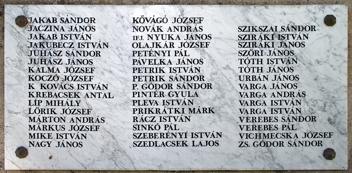 Fóton a városháza mellett találjuk a város I. világháborús emlékműve, amelyen két emléktábla örökíti meg a település hősi halottainak a neveit. A második emléktábla szövege: "Jakab Sándor, Jaczina János, Jakab István, Jakubecz István, Juhász Sándor, Juhász János, Kalma József, Koczó József, K. Kovács István, Krebacsek Antal, Líp Mihály, Lőrik József, Márton András, Márkus József, Mike István, Nagy János, Kővágó József, Novák András, ifj. Nyuka János, Olajkár József, Petényi Pál, Pávelka János, Petrik István, Petrik Sándor, P. Gódor Sándor, Pintér Gyula, Pleva István, Prikrátki Márk, Rácz István, Sinkó Pál, Szeberényi István, Szedlacsek Lajos, Szikszai Sándor, Sziráki István, Sziráki János, Szőri János, Tóth István, Tóth János, Urbán János, Varga János, Varga András, Varga István, Varga István, Verebes Sándor, Verebes Pál, Vichmecska József, Zs. Gódor Sándor".
