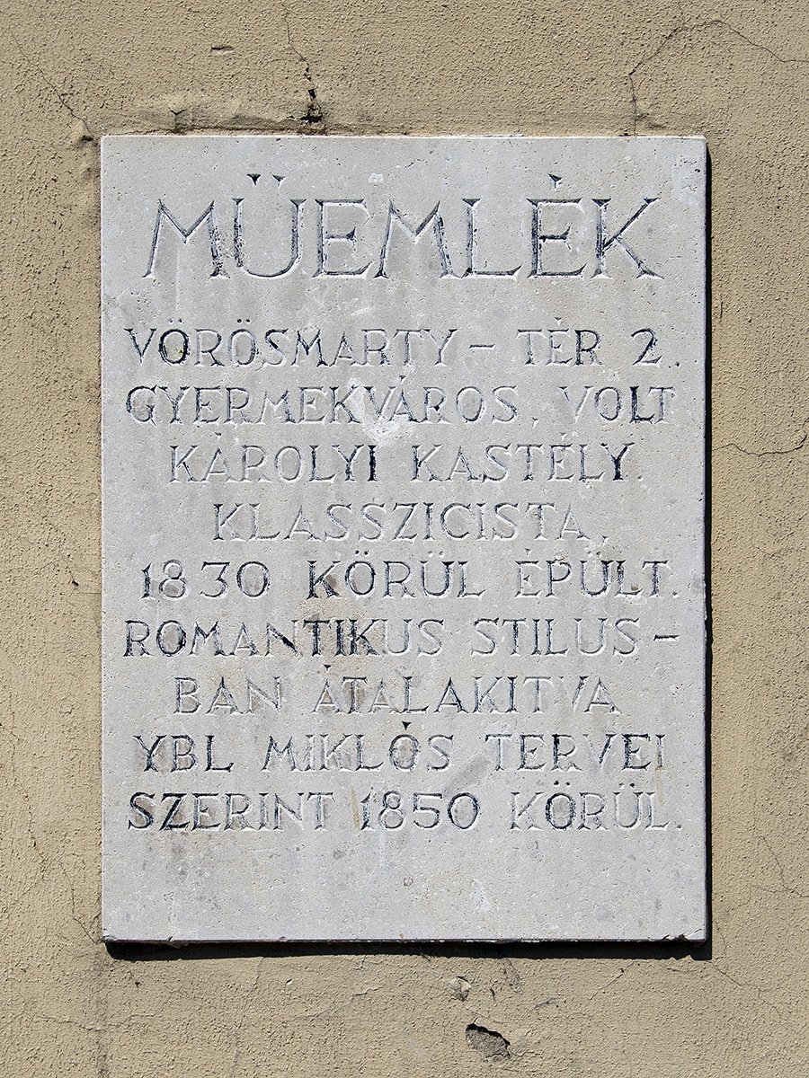 Fóton, a Károlyi-kastély park felé eső homlokzatán találjuk az épület műemléki jellegét hirdető emléktáblát. Fót 1808-ban került a Károlyi család birtokába. A mai kastély helyén álló egykori földszintes kúriát a XVIII. század végén ismeretlen építőművész tervei alapján emelték. 1830-tól az épületet többször jelentősen átalakították, bővítették. Az átalakítási és értékteremtő tevékenységnek Károlyi István gróf (1797-1881) volt a fő kezdeményezője és végrehajtója, aki korának igen jelentős művészetpártolója, jótékonysági tevékenységek bőkezű támogatója volt. Károlyi István gróf Batthyány Lajos miniszter ikervári kastélyában egy véletlen találkozás alkalmával ismerkedett meg az akkor még kevésbé ismert Ybl Miklós építésszel. Meghívta Fótra, hogy készítsen tervet a meglévő kastély bővítésére, valamint egy katolikus templom építésére. Az 1840-es évek átalakításait Ybl Miklós vezette, a kastély ekkor nyerte el a klasszicista stílusú külső képét. Ebben az időben bővítették és korszerűsítették a belső tereket is. Többek között létrehoztak mindkét szinten egy-egy könyvtárat, s reprezentatív berendezésű és díszítésű szobákat alakítottak ki. A szalon jellegű termek falait Munkácsy Mihály, Lotz Károly, Ligeti Antal és más híres festők festményei díszítették, a fal melletti tárlókban pedig az igen értékes kőzetgyűjtemény kapott helyet. Minden helyiség egyedi intarziával ellátott parkettát kapott, a falakat eleinte romantikus, majd historizáló festéssel díszítették. Ezzel párhuzamosan a kastélyt körülvevő parkban halastavat létesítettek, s ekkor történt a kert különleges növény- és faegyütteseinek telepítése is. Az emléktábla szövege: "Műemlék Vörösmarty – tér 2. Gyermekváros. Volt Károlyi-kastély. Klasszicista. 1830 körül épült. Romantikus stílusban átalakítva Ybl Miklós tervei szerint 1850 körül."