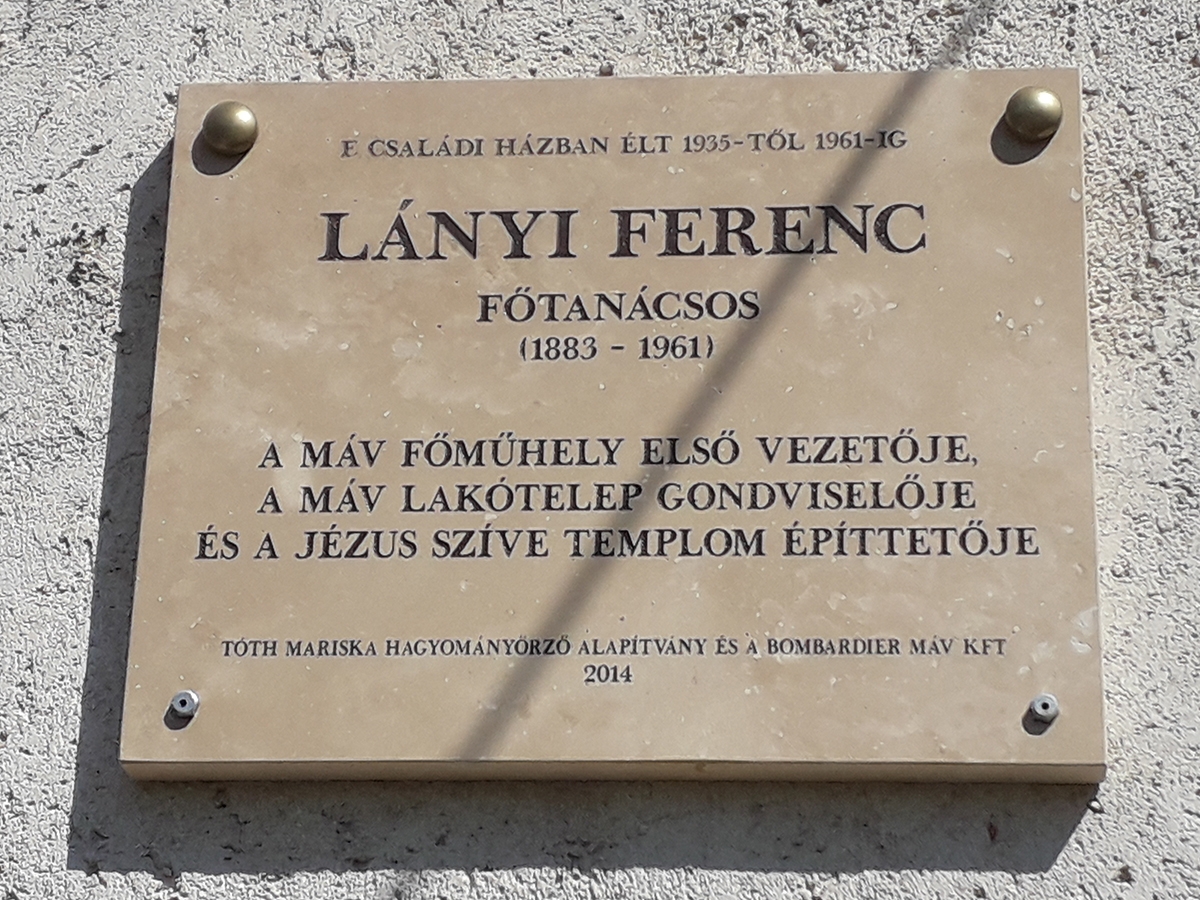 1935-től 1961-ig élt a Liget utcai házban Lányi Ferenc főműhely vezető, „aki európai léptékű és színvonalú teremtőerővel megáldott ember volt.” Emléke előtti tisztelgésként a Tóth Mariska Hagyományőrző Egyesület kezdeményezésére emléktáblát avattak egykori háza falán. Lányi Ferenc 1925-ben kapott megbízást a Dunakeszi MÁV Főműhely és az épülő MÁV lakótelep építési munkálatainak irányítására. Az 1926-ban megnyílt üzem 600 főnek adott munkát és megélhetést. 1927. február 26-án került sor a beiktatására, és nyugdíjba meneteléig, 1944-ig a Főműhely vezetője volt. A szakmai munkálatok irányítása mellett gondja volt a dolgozók szakmai képzésére, testi és szellemi gyarapodására. Megalapította a Magyarság Dal és Önképző Egyletet, irányításával megépült a Magyarság sportpálya, a Duna-parti csónakház. 1944-ben felavatták a Jézus Szíve templomot. Gondját viselte a ma is ”építészeti ékszerdobozként” emlegetett gyártelepi kolóniának. Támogatta az ifjúsági mozgalmakat, a lengyel-magyar baráti együttműködést. Jó kapcsolatai révén a Főműhelyben készültek el a kormányzói kocsik és az 1938-ban, a Szent Jobbot az országban bemutató Aranyvonat „aranykocsija”. Termelési, kulturális és sporteredményeivel a Dunakeszi Műhelytelep országos hírnevet vívott ki. Lányi Ferenc számos kitüntetést kapott, 2002-ben a város tisztelete jeléül sétányt nevezett el róla. Az emléktábla avatóbeszédét Juhász Róbert, a Bombardier MÁV Kft. titkára mondta. A család nevében az egyik unoka, Dr. Lányi Cecília emlékezett és idézte fel a nagypapa életútját. Az emléktáblát, Lengyel István szobrászművész alkotását a másik unoka, Lányi Ferenc leplezte le.