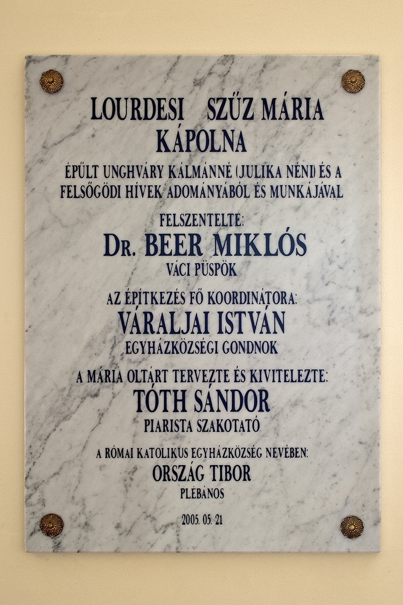 A felsőgödi Jézus Szíve templom oldalhajójában található a Lourdesi Szűz Mária kápolna. A kápolna falán emléktáblán helyeztek el 2005. májusában. Az emléktábla a kápolna építésében közreműködőket sorolja fel. A tábla szövege: "Lourdesi Szűz Mária kápolna Unghváry Kálmánné (Julika néni) és a felsőgödi hívek adományából és munkájával. Felszentelte dr. Beer Miklós váci püspök. Az építkezés fő koordinátora: Váraljai István egyházközségi gondnok. A Mária oltárt tervezte és kivitelezte: Tóth Sándor piarista szakoktató. A római katolikus egyházközség nevében Ország Tibor plébános. 2005 05 21."
