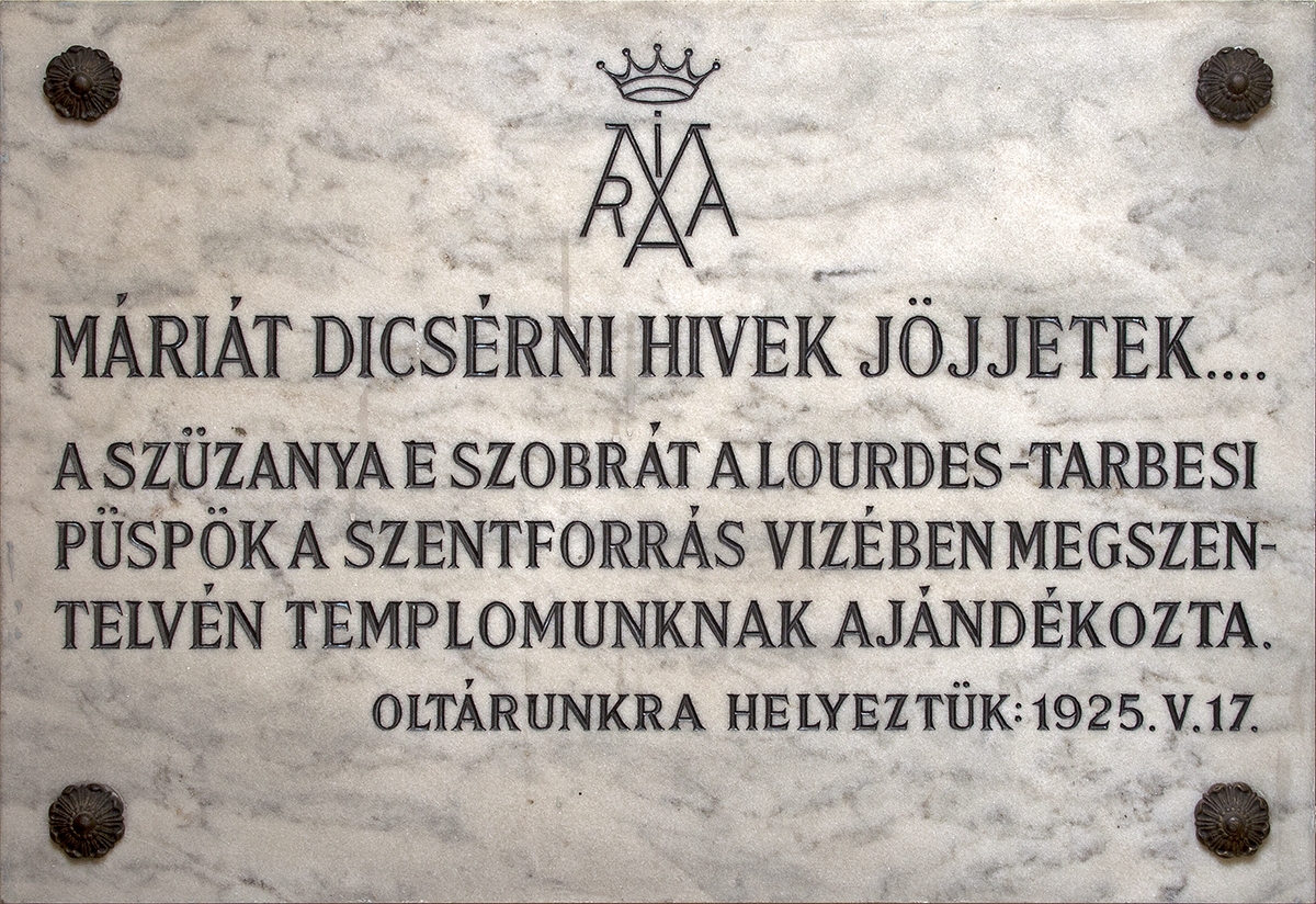 A felsőgödi Jézus Szíve templom oldalhajójában, a Szűz Mária kápolnában található a lourdesi Szűz Mária-szobor Felsőgödre érkezésének emléket állító emléktábla. A szép kivitelű szobrot a újonnan felépített (1924) templomnak adományozta a lourdes-tarbesi püspök. Az emléktála szövege: "Máriát dicsérni hívek jöjjetek… A szűzanya e szobrát a lourdes-tarbesi püspök a szentforrás vízében megszentelvén templomunknak ajándékozta. Oltárunkra helyeztük: 1925. V. 17."